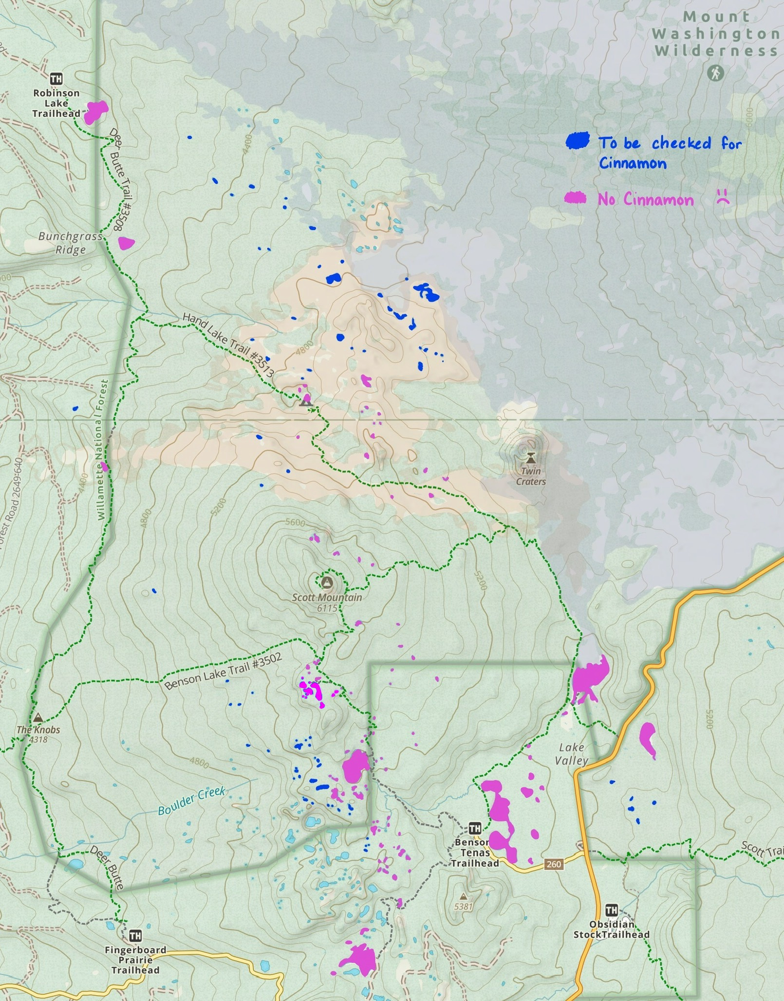 If you do any of these activities, or can share this page with someone who does, we can really use your help sharing this page to these communities! If he's alive, Cinnamon could have traveled some distance, perhaps 10 miles from Scott Mountain (44.240622, -121.915142) in any direction, perhaps more: